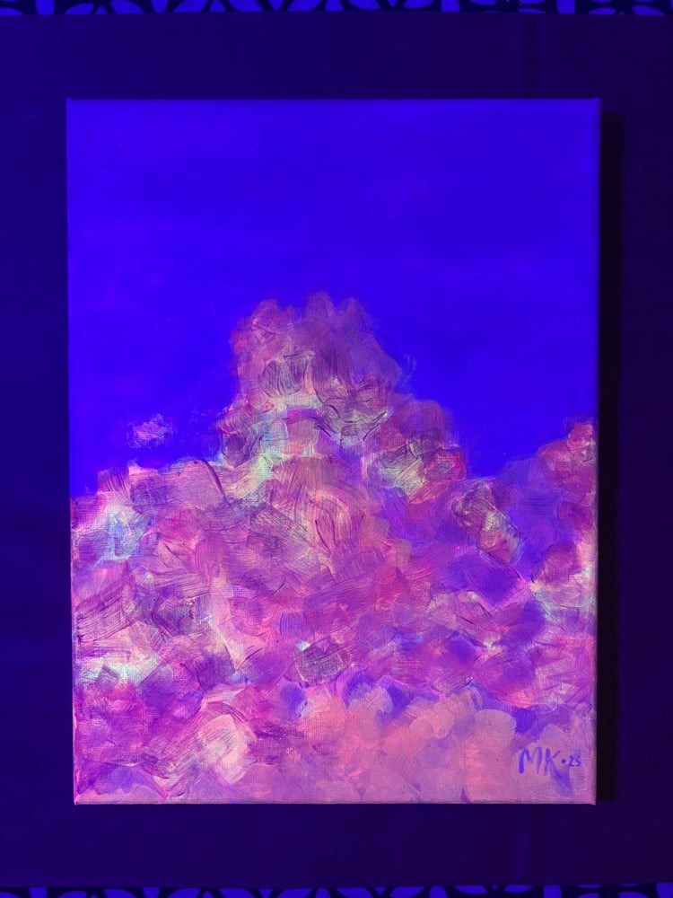 Painted using fluorescent pigment paints that glow under Ultra Violet lighting but also look fantastically luminous under natural lighting.
